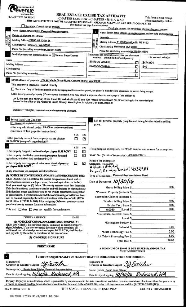 | 1 | 10/30/2016 | PRD | Personal Representatives Deed | STITELER, SARAH JANE | STITELER, SARAH JANE | | | $0.00 | 27593 | 4414504 |