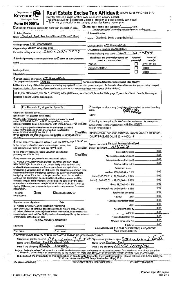 | 2 | 02/26/2021 | PRD | Personal Representatives Deed | EVERTT, CLAUDINE L | EVERTT, CLAUDINE | | | $0.00 | 47168 | 4512438 |