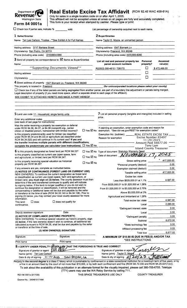 | 1 | 11/17/2025 | WD | Warranty Deed | MONTOYA TTEE, TINA MARIE | MOORE, TAYLOR D | | | $417,000.00 | 65497 | 4593662 |