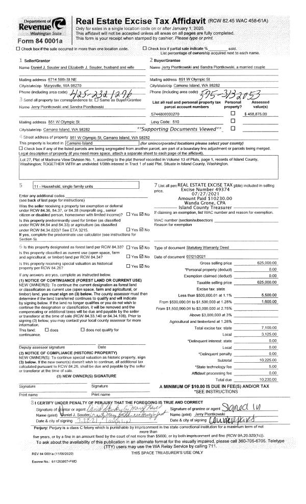 | Mailing Address: | SANDRA PIONTKOWSKI 851 OLYMPIC ST CAMANO ISLAND, WA 98282 | % Ownership: | 100.0000000000% |