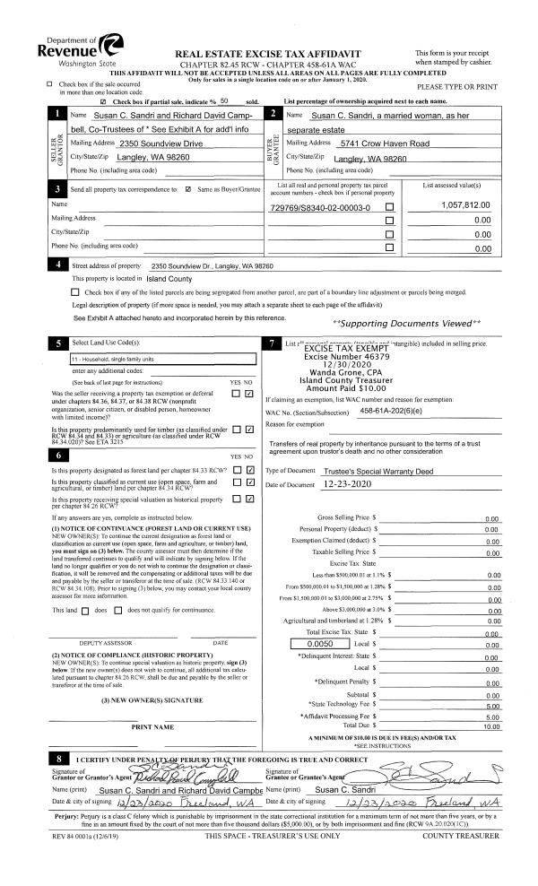 | 2 | 12/23/2020 | WD | Warranty Deed | CAMPBELL TRUSTE 50% INTE, R BRUCE | SANDRI, SUSAN C | | | $0.00 | 46378 | 456721 |