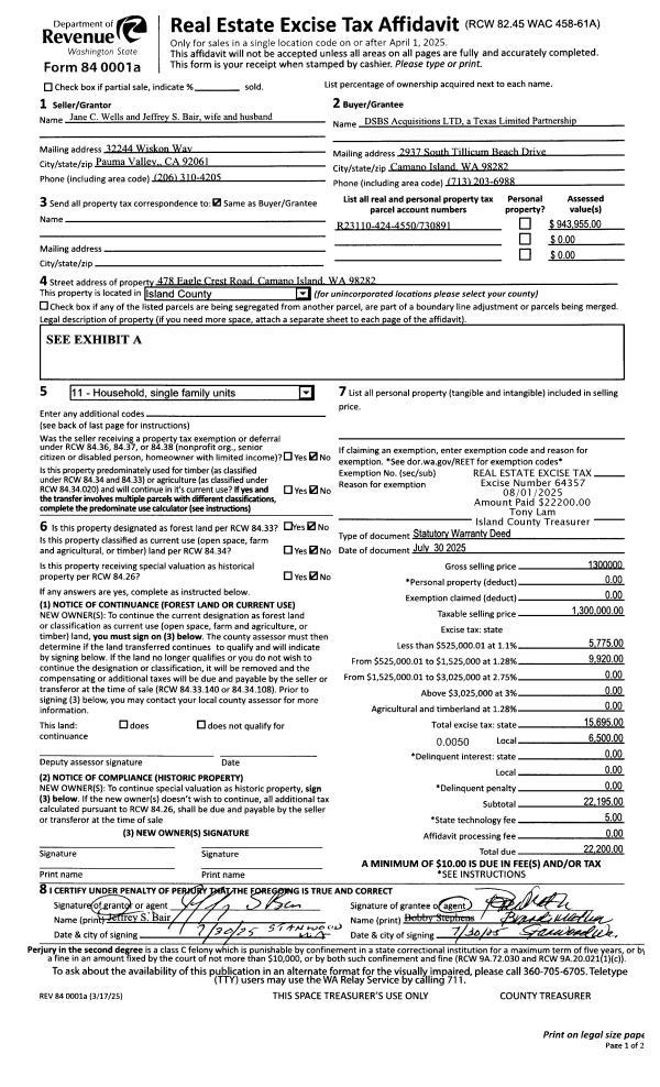 | 1 | 07/30/2025 | WD | Warranty Deed | BAIR, JEFFREY S | DSBS ACQUISITIONS LTD | | | $1,300,000.00 | 64357 | 4589074 |