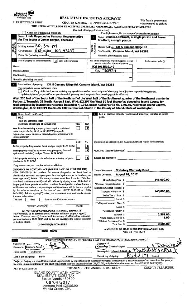| Mailing Address: | SUSAN BRADFORD 131 S CAMANO RIDGE RD CAMANO ISLAND, WA 98282 | % Ownership: | 100.0000000000% |