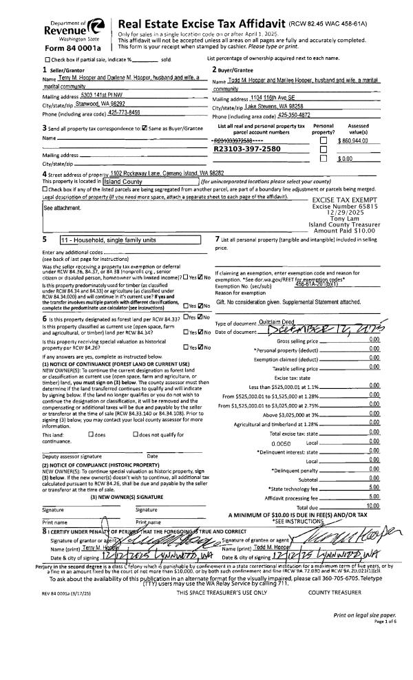 | 1 | 12/12/2025 | QCD | Quit Claim Deed | HOOPER, TERRY | HOOPER, TODD M | | | $0.00 | 65815 | 4595130 |