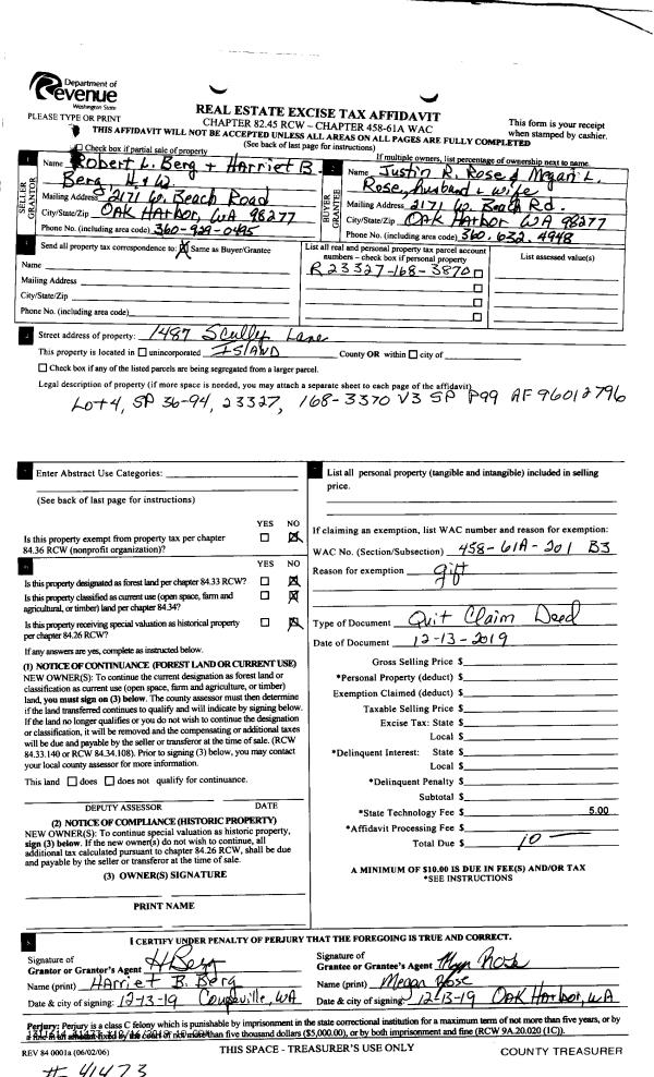 | Mailing Address: | MEGAN L ROSE 1487 SCULLY LANE OAK HARBOR, WA 98277 | % Ownership: | 100.0000000000% |