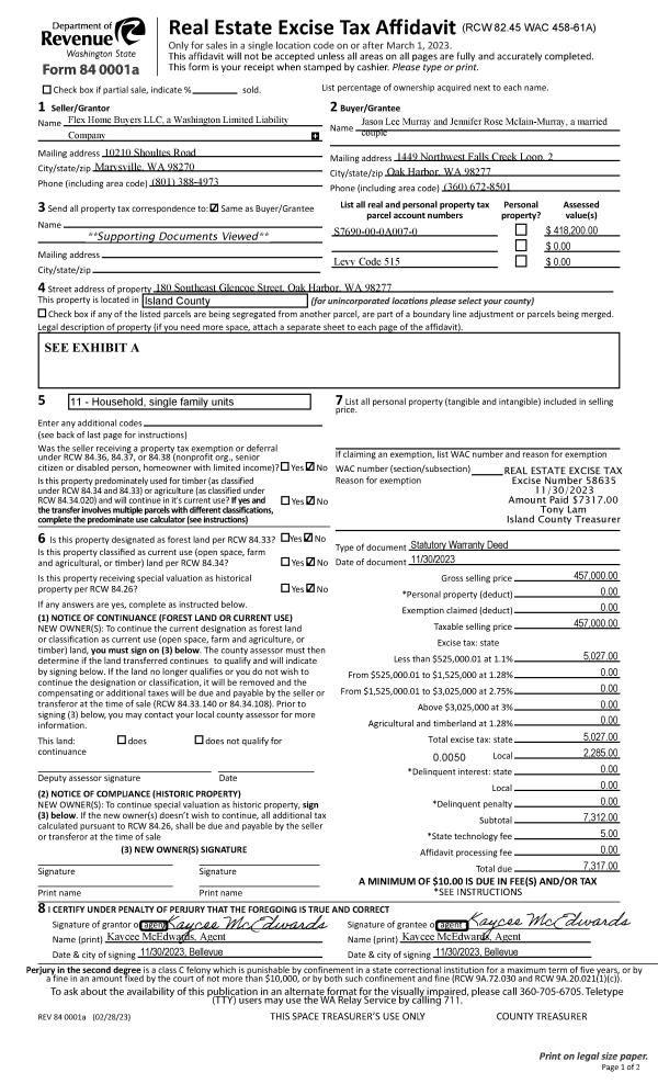 | 1 | 11/30/2023 | WD | Warranty Deed | FLEXHOMEBUYERS LLC | MURRAY, JASON LEE | | | $457,000.00 | 58635 | 4567146 |