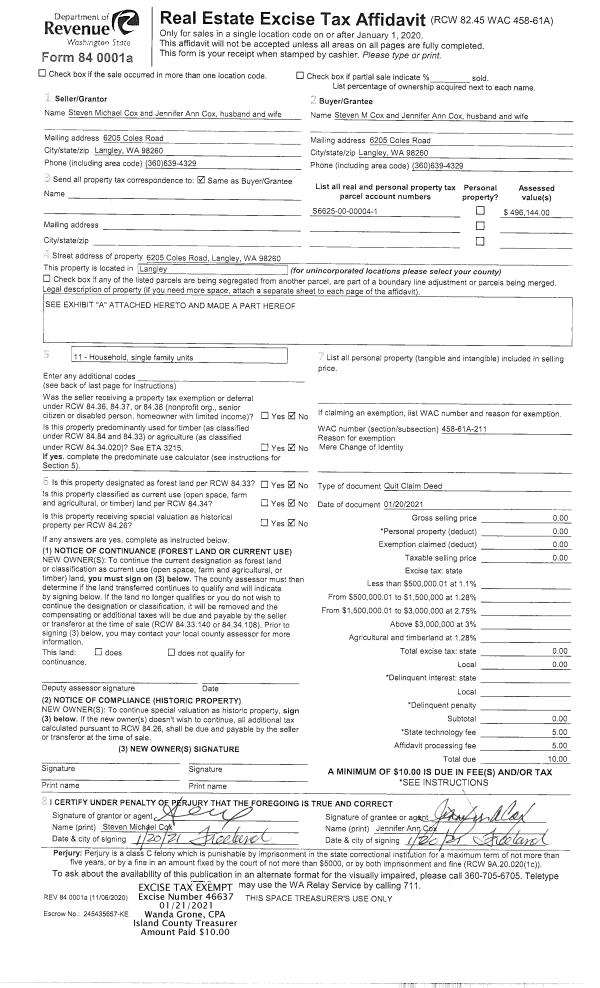 | 2 | 01/20/2021 | QCD | Quit Claim Deed | COX, STEVEN MICHAEL | COX, STEVEN M | | | $0.00 | 46637 | 4508678 |