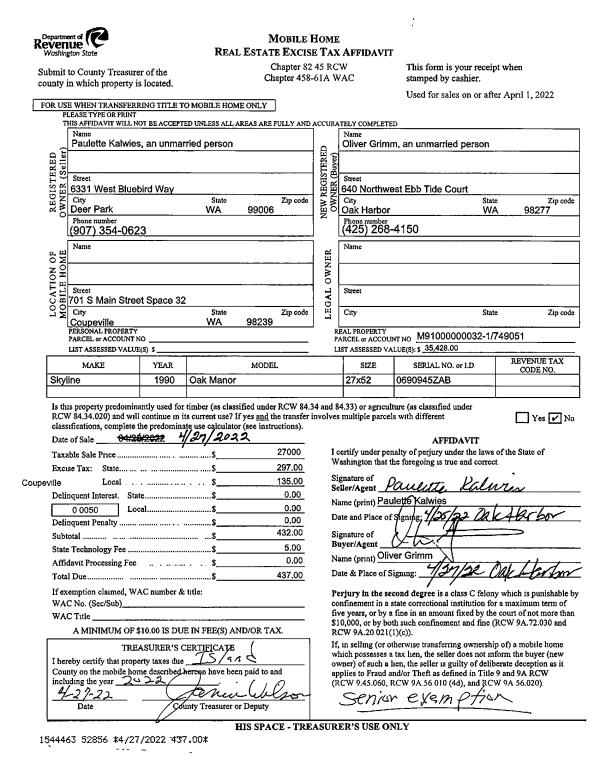 | 2 | 04/27/2022 | MANHOME | Manufactured Home | KALWIES, PAULETTE M | GRIMM, OLIVER | | | $27,000.00 | 52856 | |