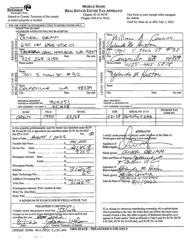 | 1 | 08/01/2022 | MANHOME | Manufactured Home | GRIMM, OLIVER | CONNER, WILLIAM A | | | $195,000.00 | 53986 | |
