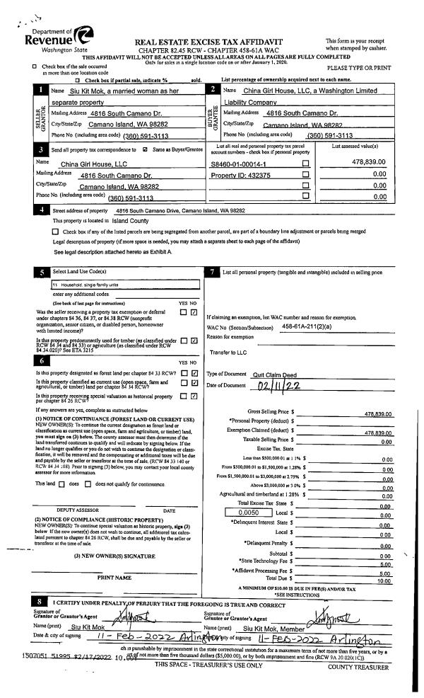 | Mailing Address: | DONNA L WATSON 1141 CAVALERO RD CAMANO ISLAND, WA 98282-8450 | % Ownership: | 100.0000000000% |