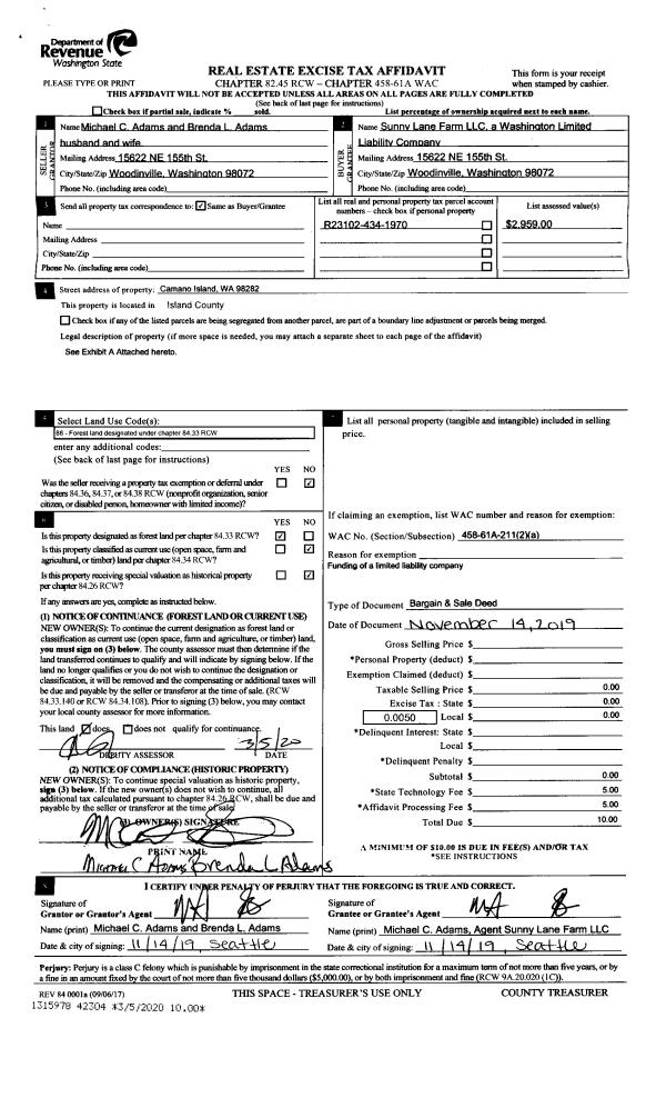 | 2 | 11/14/2019 | BARGSLD | Bargain And Sale Deed | ADAMS, MICHAEL | SUNNY LANE FARM, LLC | | | $0.00 | 42304 | 4482510 |