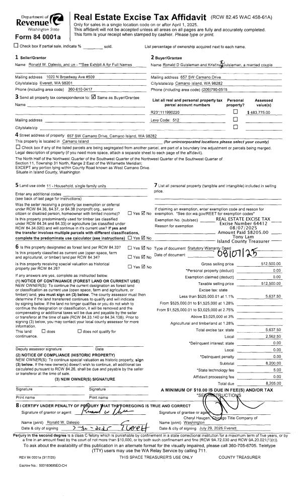 | 1 | 08/07/2025 | WD | Warranty Deed | DALESIO, RONALD | GUISLEMAN, RONALD D | | | $512,500.00 | 64412 | 4589313 |