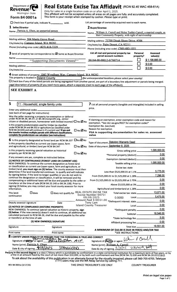 | 1 | 09/08/2025 | WD | Warranty Deed | OLSEN, PATRICIA A | CARROLL, WILLIAM | | | $1,095,000.00 | 64751 | 4590666 |