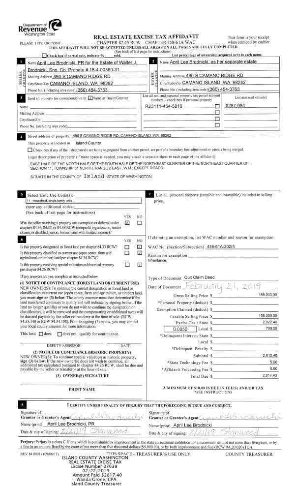 | 1 | 05/06/2019 | QCD | Quit Claim Deed | BRODNICKI, WALTER J | BRODNICKI, APRIL L | | | $158,000.00 | 37639 | 4459488 |