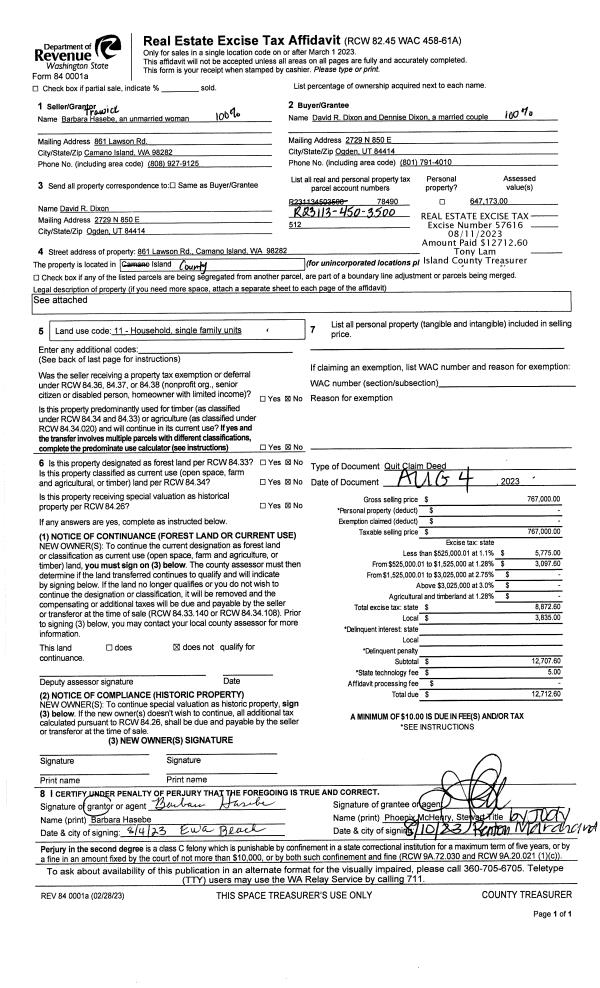 | 1 | 08/04/2023 | QCD | Quit Claim Deed | HASEBE, EDWIN NORIO | DIXON, DAVID R | | | $767,000.00 | 57616 | 4563395 |