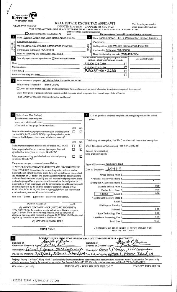 | 3 | 02/14/2018 | QCD | Quit Claim Deed | GREEN, GARETH | LARSON-GREEN, LLC | | | $0.00 | 32999 | 4439481 |