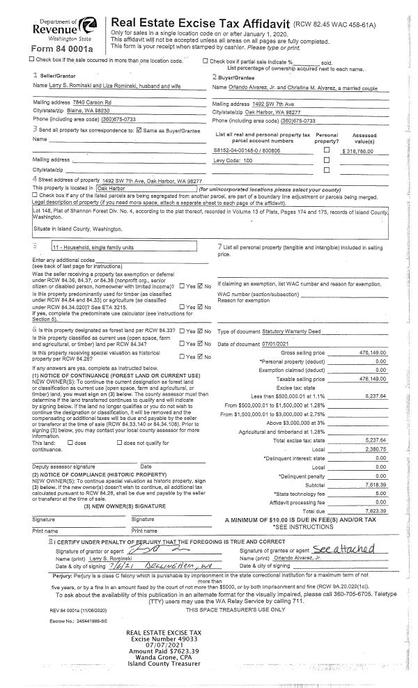 | Mailing Address: | CHRISTINA M ALVAREZ 1492 SW 7TH AVE OAK HARBOR, WA 98277 | % Ownership: | 100.0000000000% |