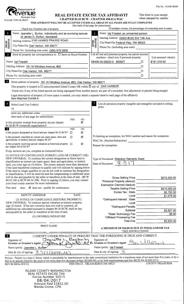 | Mailing Address: | TAMMY WALKER 161 W WHIDBEY AVE UNIT 20 OAK HARBOR, WA 98277 | % Ownership: | 100.0000000000% |