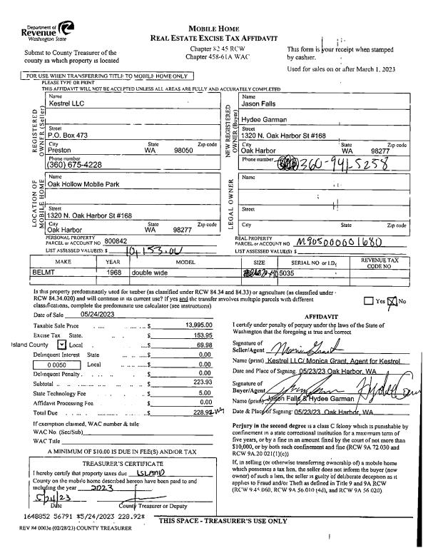 | 3 | 05/24/2023 | MANHOME | Manufactured Home | KESTREL LLC | FALLS, JASON | | | $13,995.00 | 56791 | |