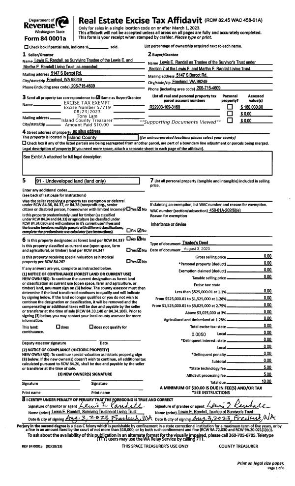 | 1 | 08/03/2023 | TRUSTEED | Trustee's Deed | LEWIS E / M E RANDALL TRTEES, MARTHA RANDALL TRUST | RANDALL TTEE, LEWIS E | | | $0.00 | 57719 | 4563870 |