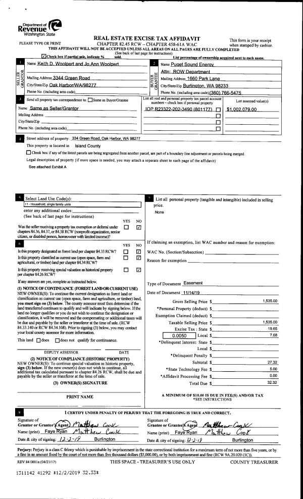 | 4 | 11/14/2019 | EZ | Easement | WOOLPERT, JO ANN | PUGET SOUND ENERGY | | | $1,535.00 | 41292 | 4476619 |