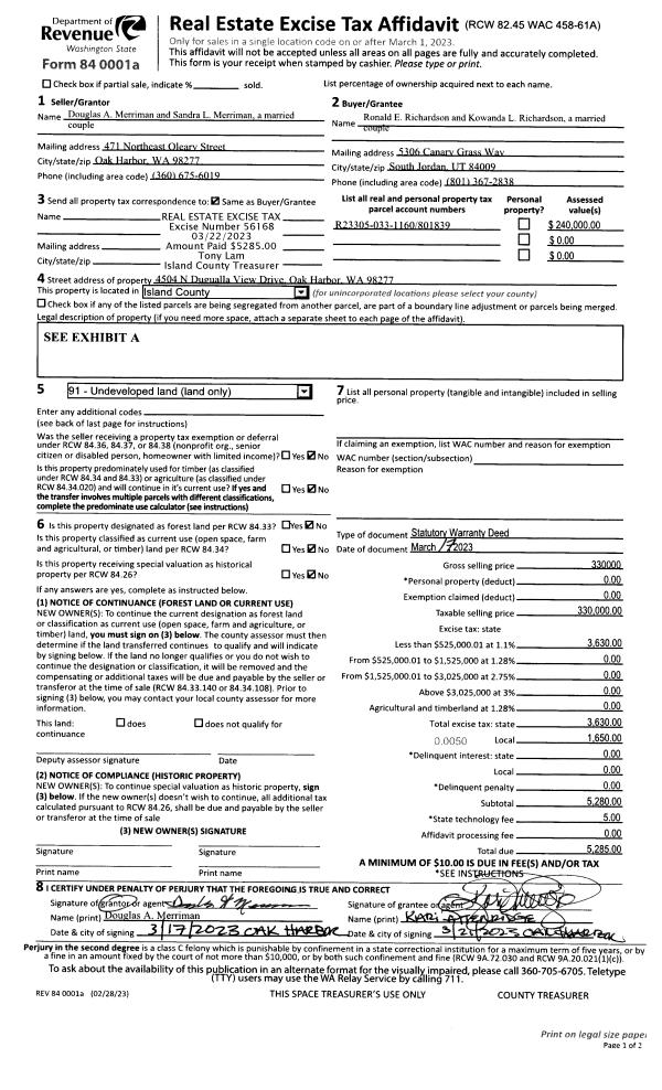 | 1 | 03/17/2023 | WD | Warranty Deed | MERRIMAN, DOUGLAS A | RICHARDSON, RONALD E | | | $330,000.00 | 56168 | 4557970 |