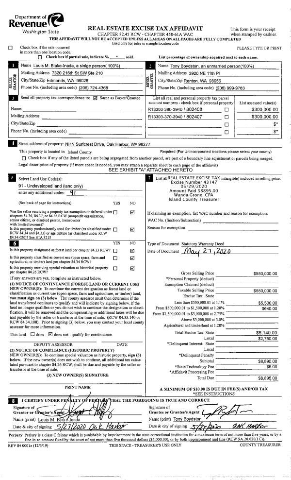 | 1 | 05/27/2020 | WD | Warranty Deed | BLAKE-INADA, LOUIS M | BOYDSTON, TONY | | | $550,000.00 | 43147 | 4487626 |