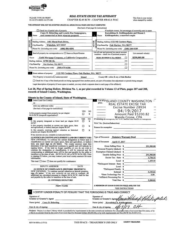 | 1 | 04/17/2017 | WD | Warranty Deed | HEBERLING JTWROS, CASEY D | KELIIKUPAKAKO, KAWAILEHUA K | | | $291,900.00 | 28934 | 4420962 |