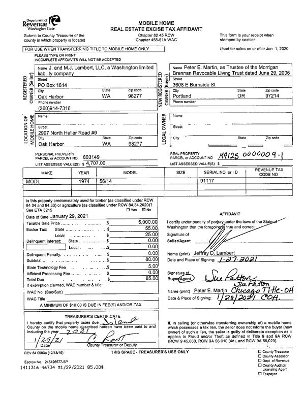 | 1 | 01/29/2021 | MANHOME | Manufactured Home | J. AND M.J. LAMBERT, LLC | MARTIN TTEE, PETER E | | | $5,000.00 | 46734 | |