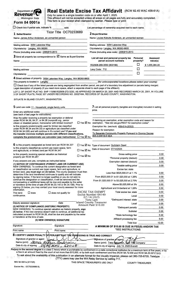 | 1 | 07/14/2025 | QCD | Quit Claim Deed | ANDERSON, JAMES ARTHUR | ANDERSON, LOUISE KOBUKE | | | $0.00 | 64149 | 4588253 |
