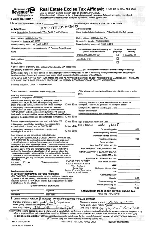 | 2 | 07/11/2025 | QCD | Quit Claim Deed | ANDERSON TTEE, JAMES ARTHUR | ANDERSON, LOUISE KOBUKE | | | $0.00 | 64148 | 4588252 |