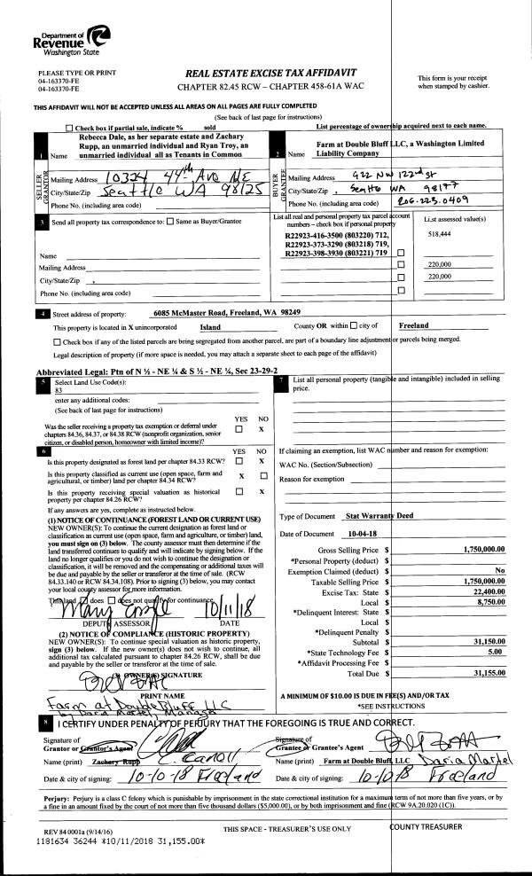 | 1 | 10/04/2018 | WD | Warranty Deed | DALE, REBECCA | FARM AT DOUBLE BLUFF LLC | | | $1,750,000.00 | 36244 | 4453240 |