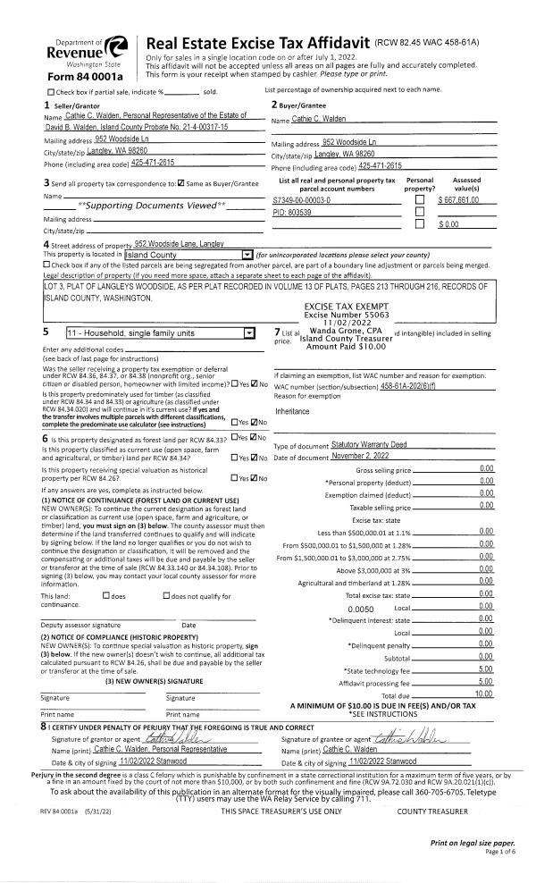 | 2 | 11/02/2022 | WD | Warranty Deed | WALDEN, DAVID B | WALDEN, CATHIE C | | | $0.00 | 55063 | 4553381 |