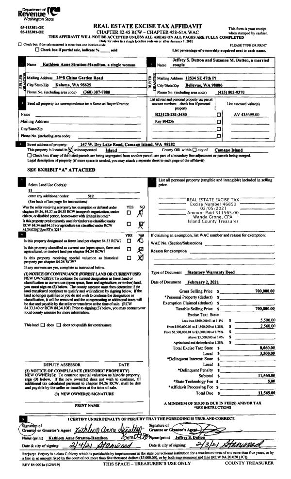 | 1 | 02/02/2021 | WD | Warranty Deed | STRATTON-HAMILTON, KATHLEEN ANNE | DUTTON, JEFFREY S | | | $700,000.00 | 46850 | 4510185 |