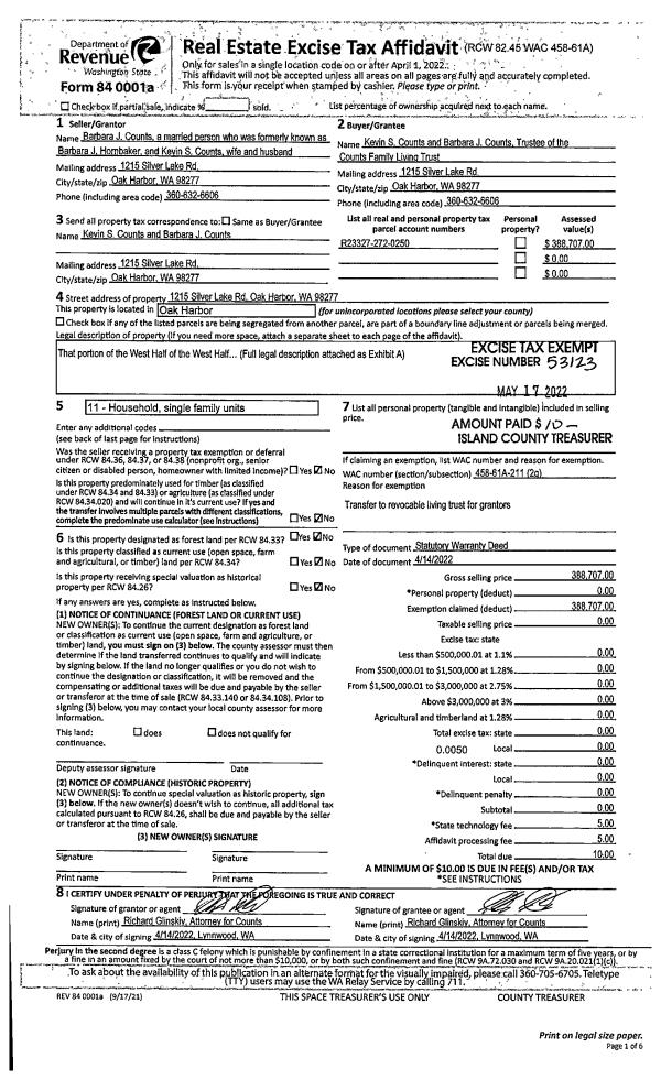 | Mailing Address: | BARBARA J COUNTS TTEE 1215 SILVER LAKE RD OAK HARBOR, WA 98277 | % Ownership: | 100.0000000000% |