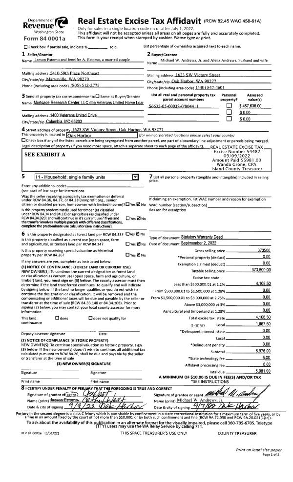 | Mailing Address: | ALENA ANDREWS 1623 SW VICTORY ST OAK HARBOR, WA 98277 | % Ownership: | 100.0000000000% |