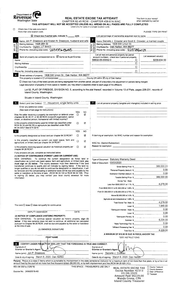 | 2 | 03/03/2020 | WD | Warranty Deed | DRASKOVIC, JON P | CROWDER, DANIELLE J | | | $389,000.00 | 42313 | 4482578 |