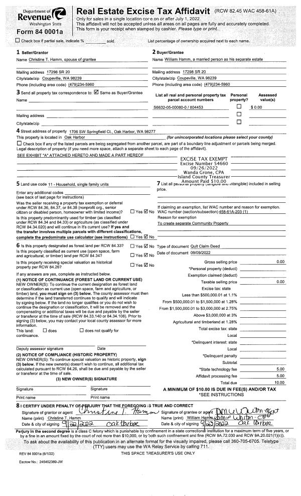 | Mailing Address: | WILLIAM HAMM CHRISTINE T HAMM 1706 SW SPRINGFIELD CT OAK HARBOR, WA 98277 | % Ownership: | 100.0000000000% |