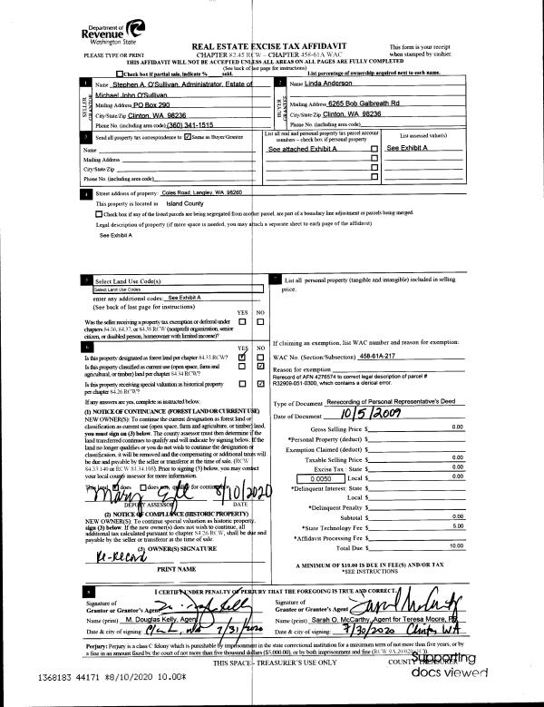 | 5 | 07/29/2005 | WD | Warranty Deed | ANDERSON, LINDA | SOUTH WHIDBEY AIRPARK LLC, | | | $98,370.00 | 53700 | 4142679 |