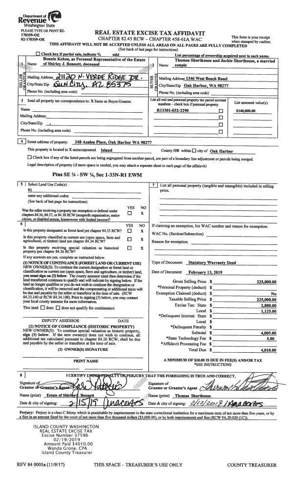 | 1 | 02/13/2019 | WD | Warranty Deed | BENNETT, SHIRLEY J | SHORTHOUSE, THOMAS | | | $225,000.00 | 37596 | 4459304 |