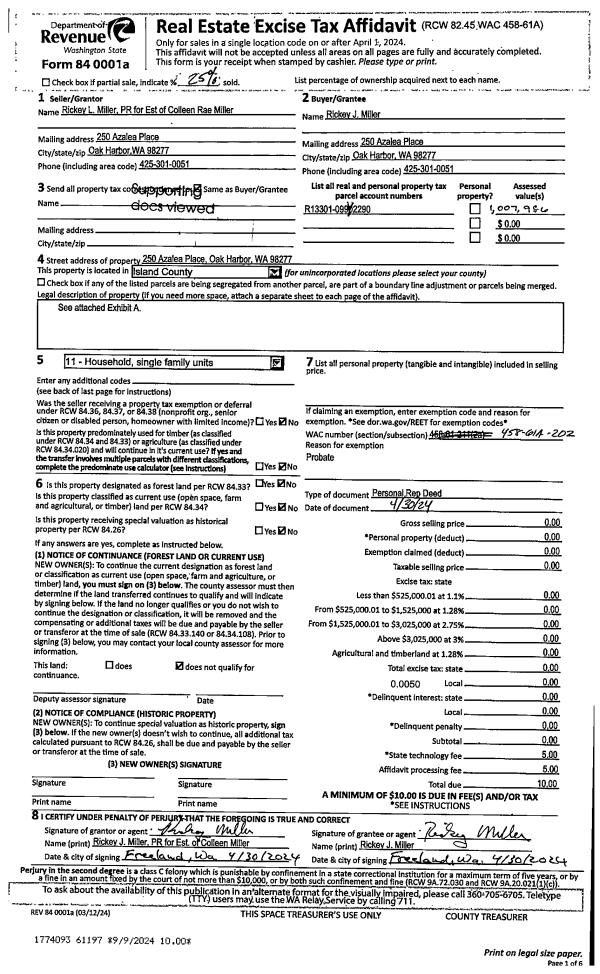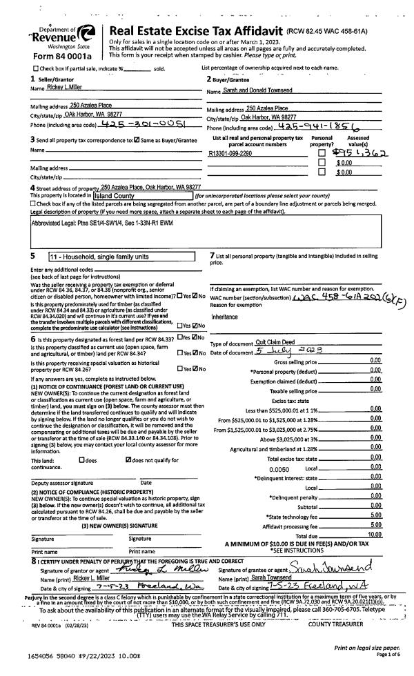 | Mailing Address: | SARA TOWNSEND, RICKEY MILLER 250 AZALEA PL OAK HARBOR, WA 98277 | % Ownership: | 100.0000000000% |