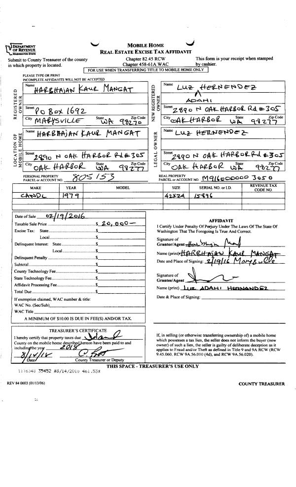 | 1 | 02/19/2016 | MANHOME | Manufactured Home | MANGAT, HARBHAJAN | HERNENDEZ, LUZ ADAHI | | | $20,000.00 | 35452 | |