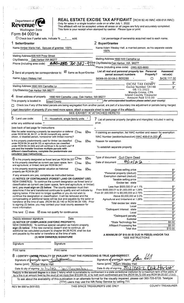 | 1 | 08/10/2022 | QCD | Quit Claim Deed | HALL, AMBER MARIE | HALL, ADAM WESLEY | | | $0.00 | 54148 | 4549640 |
