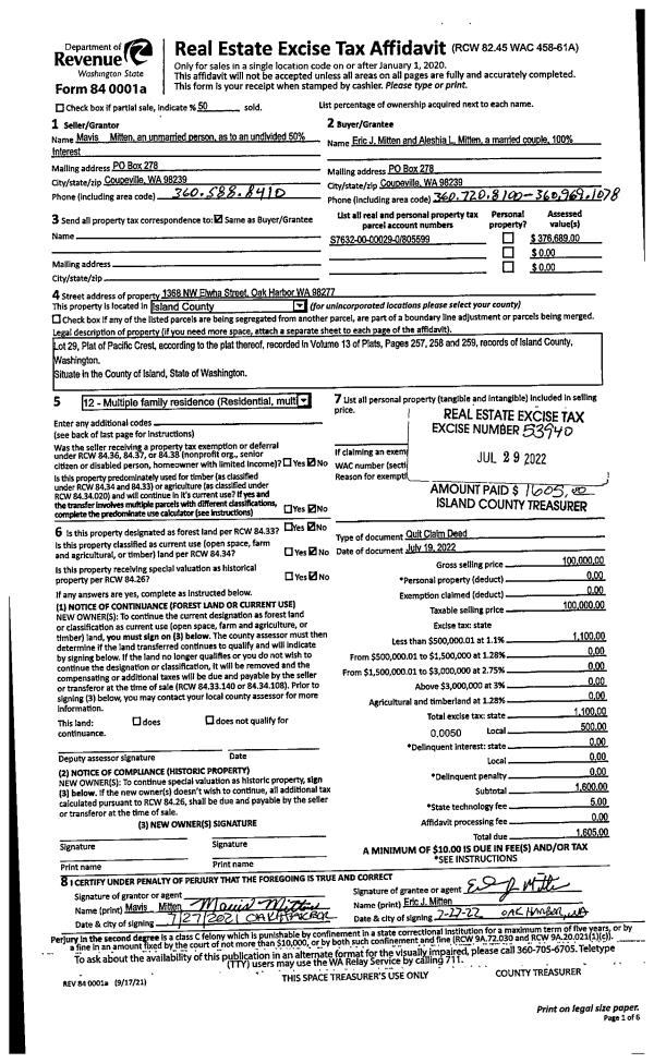 | 1 | 07/19/2022 | QCD | Quit Claim Deed | MITTEN, ERIC J | MITTEN, ERIC J | | | $100,000.00 | 53940 | 4548850 |