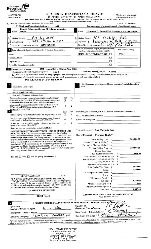 | 9 | 06/01/2005 | WD | Warranty Deed | HOLMES HARBOR LIVING LLC, | HOLMES HARBOR LIVING LLC, | | | $0.00 | 70794 | 4196050 |