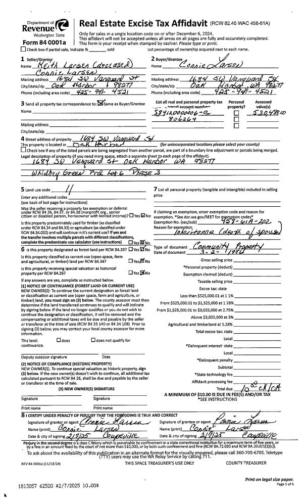 | 1 | 12/10/1974 | CPADC | Comm Prop Agmnt & Death Cert | LARSEN, KEITH | LARSEN, CONNIE | | | $0.00 | 62520 | 4582066 |