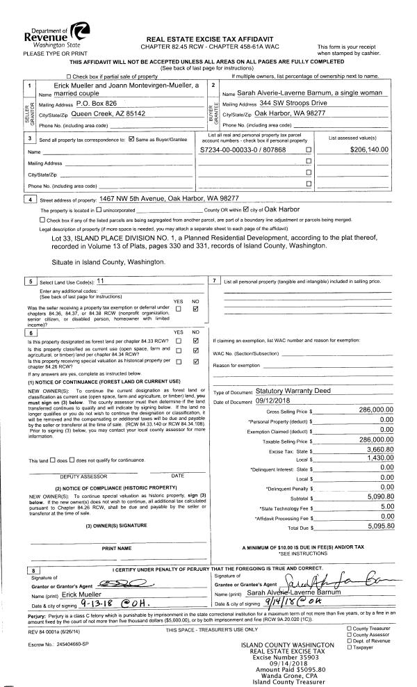 | 1 | 09/12/2018 | WD | Warranty Deed | MUELLER, ERICK | BARNUM, SARAH ALVERIE-LAVERNE | | | $286,000.00 | 35903 | 4451768 |