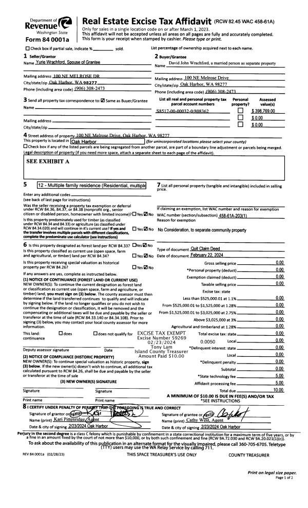 | 1 | 02/22/2024 | QCD | Quit Claim Deed | WRACHFORD, YURIE | WRACHFORD, DAVID JOHN | | | $0.00 | 59269 | 4569694 |
