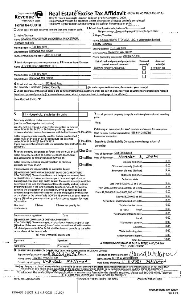 | 1 | 11/03/2021 | QCD | Quit Claim Deed | WICKSTROM, DAVID | A GOOD ROAD STORAGE LLC | | | $0.00 | 51003 | 4534215 |