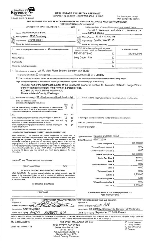 | Tax Area: | 719 - APPRAISER-S Whid Schl Dist, outside Langley, vacant & 50 acres or less | Land Use Code | 91 |